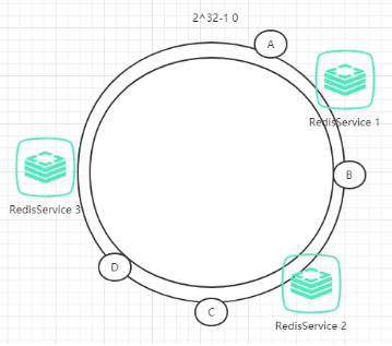 例如我们有A、B、C、D四个数据对象,经过哈希计算后,在环空间上的位置如下: