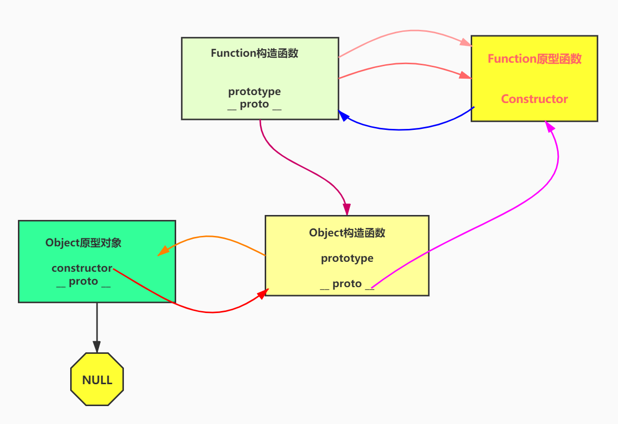 只要是对象就有__ proto __ 属性, 所以Object构造函数也有__ proto __ 属性。Object构造函数的 __ proto__ 属性指向创建它那个构造函数的原型对象。